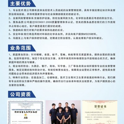新乡倍力有害生物防治有限公司是海乔全国连锁店新乡分公司。专业从事新乡灭蚊蝇,灭蚊子,灭蟑螂,灭老鼠,灭苍蝇,灭白蚁、蚊子、苍蝇、螨虫、跳蚤、蚂蚁、虱等有害生物的消杀防治工作。为住宅、超市、学校、商场、店铺、医院、工厂、商住楼、综合市政、粮食及食品仓库、加工厂、企事业单位食堂、办公楼、苗木花卉基地等场地,提供有害生物综合防治消杀服务。我们承诺把现有的蟑螂老鼠灭到一只,没有见到效果不付费。灭没再收费。 公司愿景——打造传承企业,树立海侨连锁品牌 ...